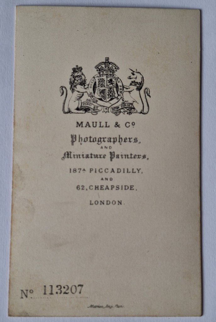 There is no indication as to the name of this woman, but if Maull & Co’s customer books still existed she could be looked up by the number on the back of the card. I simply like the tender way she looks at the baby, and the baby’s blurry arm from movement. Her hairstyle, earring, and clothing are an interesting example of the fashion of the time.