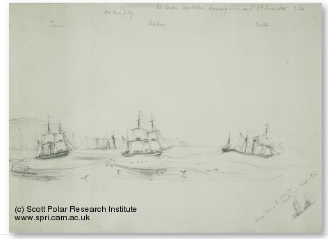 I had written thus far when Mr. Gore brought me in the sketch of our present anchorage for you, taken from the opposite side to that by Captain Fitzjames. The two ships together are the Erebus and transport, and the single one the Terror. It is a correct representation of the land and of our position. Almost immediately afterwards Captain Fitzjames brought me his sketch to look at, which he will himself send you. This is taken from Boat Island, in which Parry took his observations, as our officers are now doing. It will, therefore, be an interesting momento of the scene to show him.”
