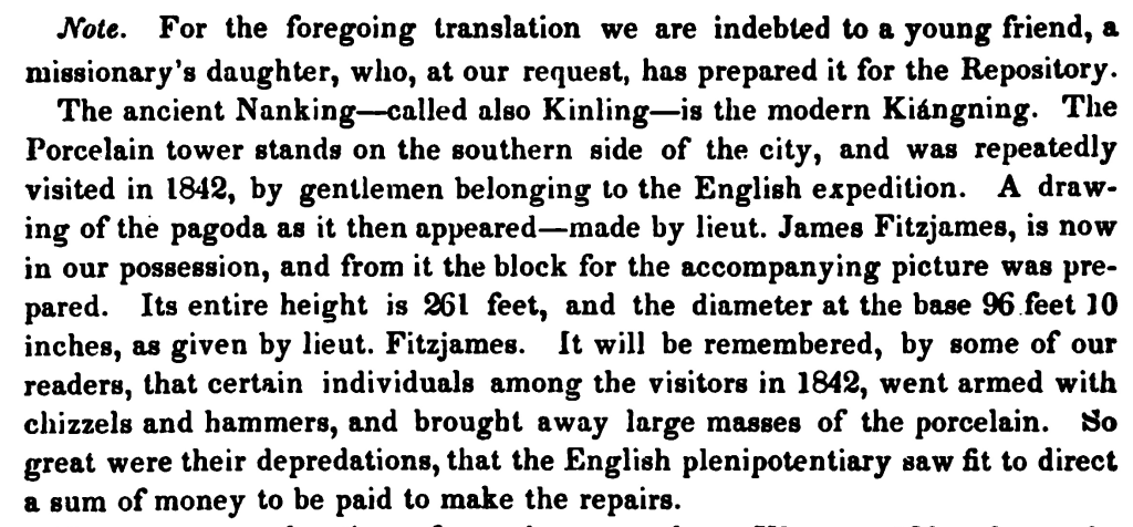 Fitzjames describes the visit to the Porcelain Tower in his Voyage of the HMS Cornwallis poem, in Canto the Eight: