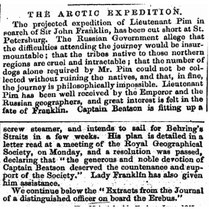 Believing in an Open Polar Sea, Lieutenant Bedford Pim (1826-1886) thought the Franklin Expedition might have sailed towards the Bering Strait via Wellington Channel but ran into trouble along the Siberian Coast. He proposed a Siberian overland expedition, but the Admiralty did not approve of his plan. In the meantime, Pim had gained the support of Lady Franklin. After the Royal Geographical Society and the prime minister provided Pim with additional funds and the proper introductions, he embarked on his journey to Russia. Where, as you can read in The Leader, his plan came to a halt. After his failed Russian expedition Pim returned to England and in April 1852 joined the Squadron under command of Edward Belcher leaving for the Arctic, where he served on the Resolute.5