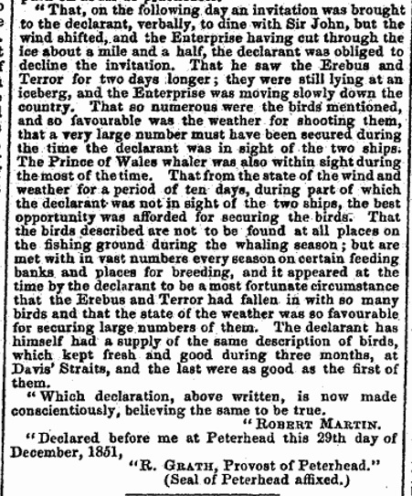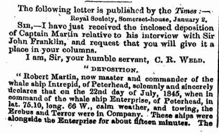 The letter had been sent to the Times by the Royal Society’s Assistant Secretary and Librarian Charles Richard Weld. Captain Robert Martin’s testimony of his conversation with John Franklin and officers, and the last sighting of the Erebus and Terror was important new information. It offers a tiny piece of the puzzle of what happened after Fitzjames’ last letter of 11 July 1845. It is highly probable that Fitzjames was one of the officers who dined aboard the Enterprise.
