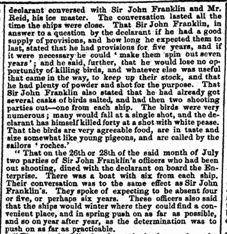 “It is gratifying to know that in the opinions of those who are best qualified to judge on the subject, Sir John Franklin and his party are yet safe, his provisions being ample with care, to last him untill the summer of 1849 ; and although, after so long an interval there is much room for speculation, yet there is no good reason for doubting the safety of the Erebus and Terror, when the usual precautions against the dangers of ice navigation are adopted.”