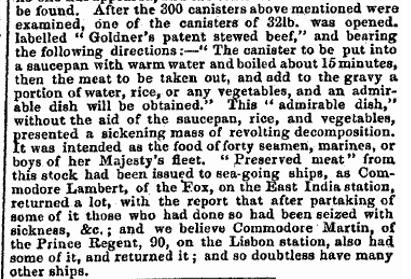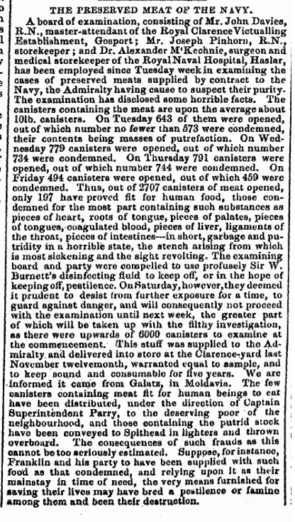 The Admiralty ordered a board of examination to investigate the state of the preserved meats supplied to the Navy after complaints going back to 1848.4