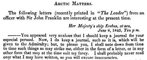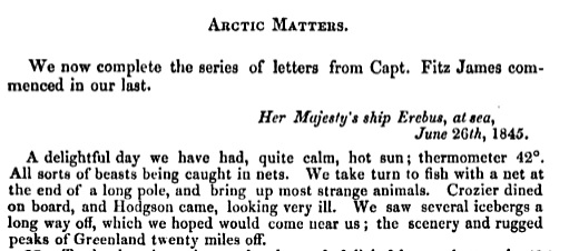 At the end of the first installment of Fitzjames’ journal, The Leader included a letter that had been published in the Times about the last sighting of the Franklin Expedition and a report of an investigation into the preserved meat supplied to the Navy for its ships.