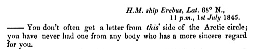 The letters are introduced anonymously (“C.” standing for Coningham) and the officer’s name is not revealed. The addressee’s name is redacted. The ”intimate friend” is of course William’s wife Elizabeth. It seems that William believed Fitzjames might still be alive at this point, as the officer is spoken of in the present tense and the expedition as ongoing.