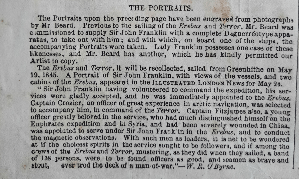 “Captain [of] Erebus” in parentheses. Fitzjames had been the Captain of Erebus all along, but after his promotion (of which he of course never received word) he was also Captain in rank. Thankfully the article accompanying the portraits does refer to him as Captain James Fitzjames.