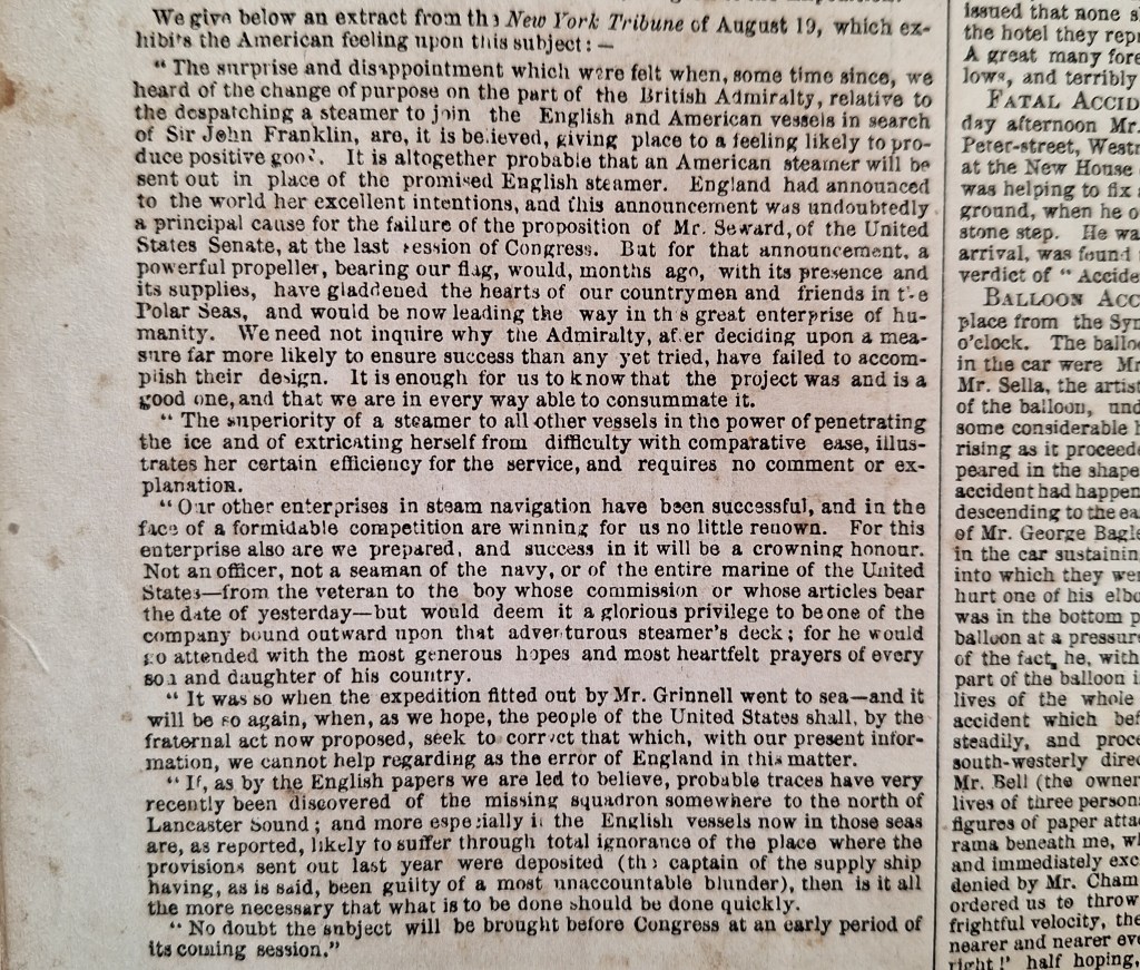It would not be until 1851 that the portraits of the now lost and very possibly departed explorers would preceed a report on the ongoing Franklin search expeditions under Captain Horatio Austin (HMS Resolute) and Captain Erasmus Ommanney (HMS Assistance). The Franklin Expedition was however no front-page news, which the ILN reserved for the invasion of Cuba to end Spanish rule. The following article accompanied the portraits: