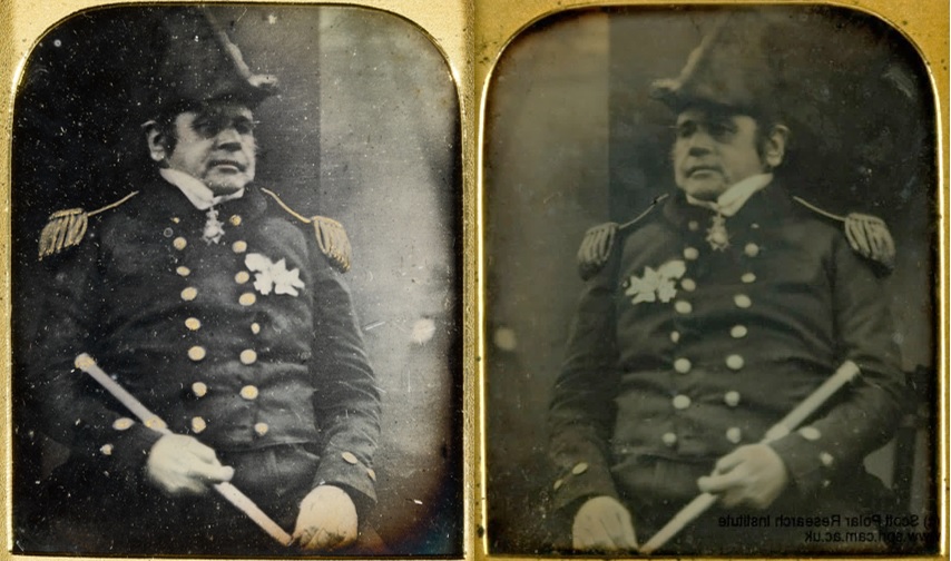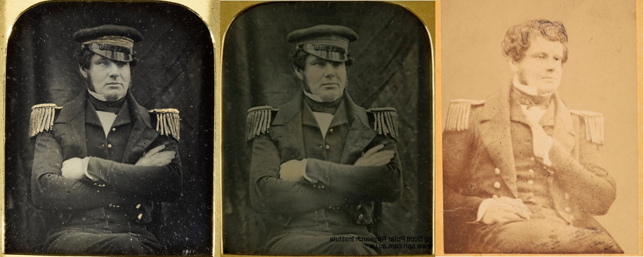 Now we have seen that a wood engraving does not automatically mean that the printed image will be reversed, and that Smyth did not reverse the portraits I have just shown. This leads to the conclusion that Richard Beard owned a set of daguerreotype copies of Lady Franklin’s original set, and that Smyth faithfully copied what he saw, flipping the drawing on the woodblock so that the orientation would be unchanged. If this is the case, then the Sotheby’s set did not belong to Richard Beard. The logical owner seems to be Lady Franklin. Beard got a set of daguerreotypes of Lady Franklin’s set of daguerreotypes and these were used to make the ILN engravings. The set at SPRI is a mix of ‘copies’ and originals, ultimately owned by the Lefroy family. Could dags from Beard’s set be among those at SPRI, meaning Beard’s set does not exist as a set anymore? If the SPRI set is not Lady Franklin’s, and the Sotheby’s set belonged to a descendant of Eleanor Gell, then Lady Franklin’s set must have been given to the Gell family rather than to Sophia Cracroft.